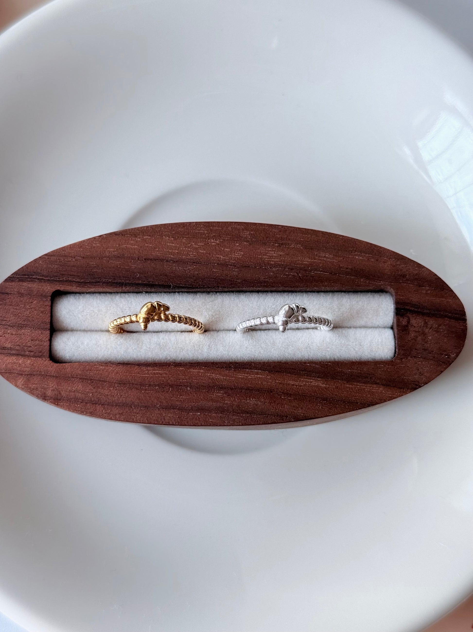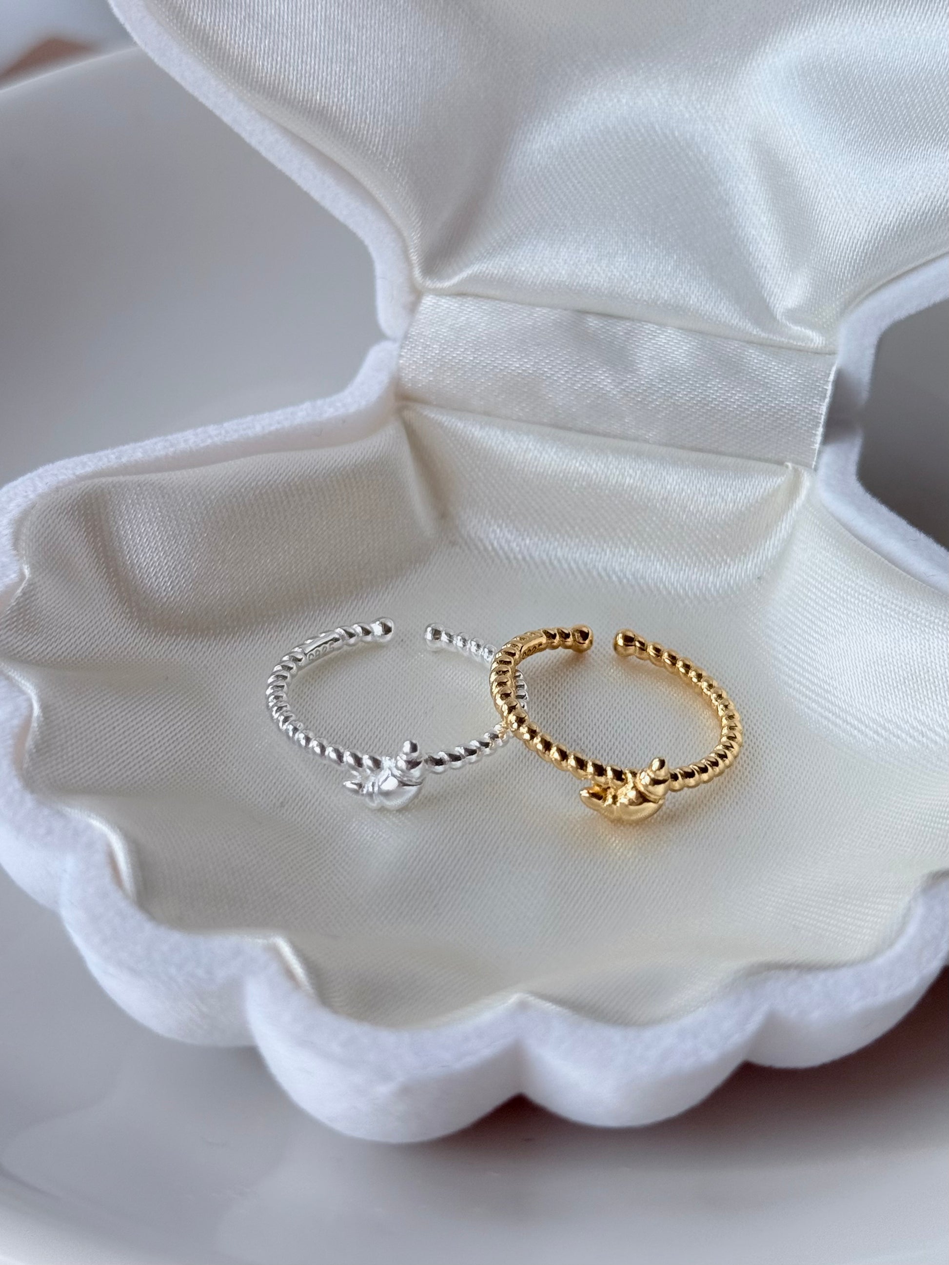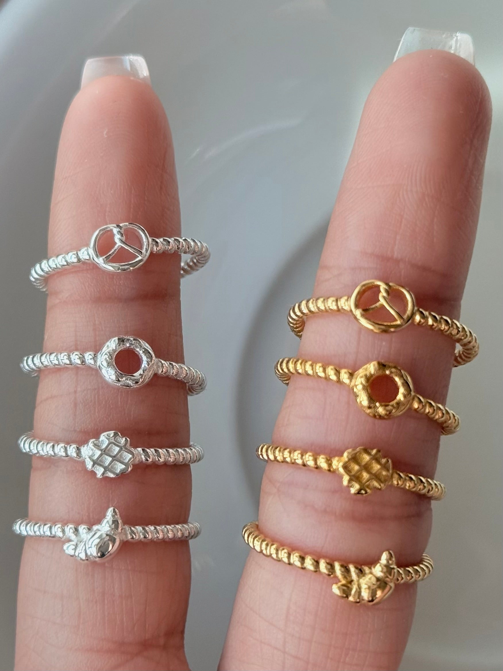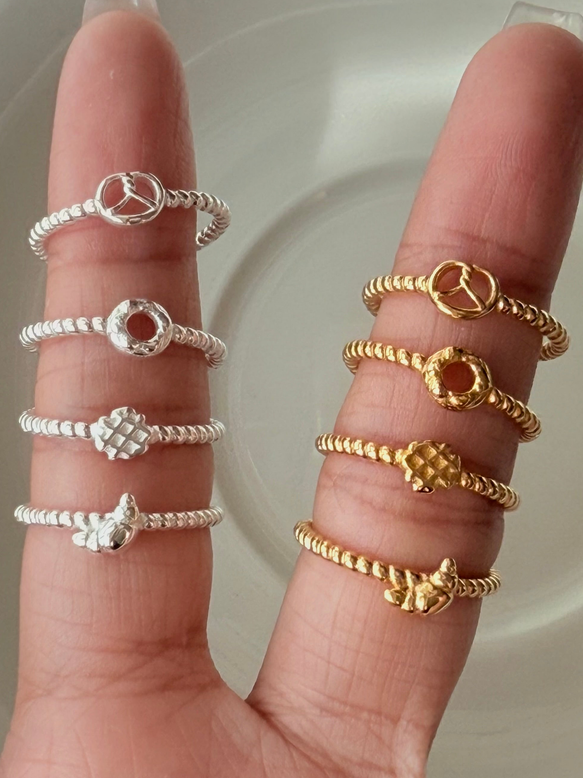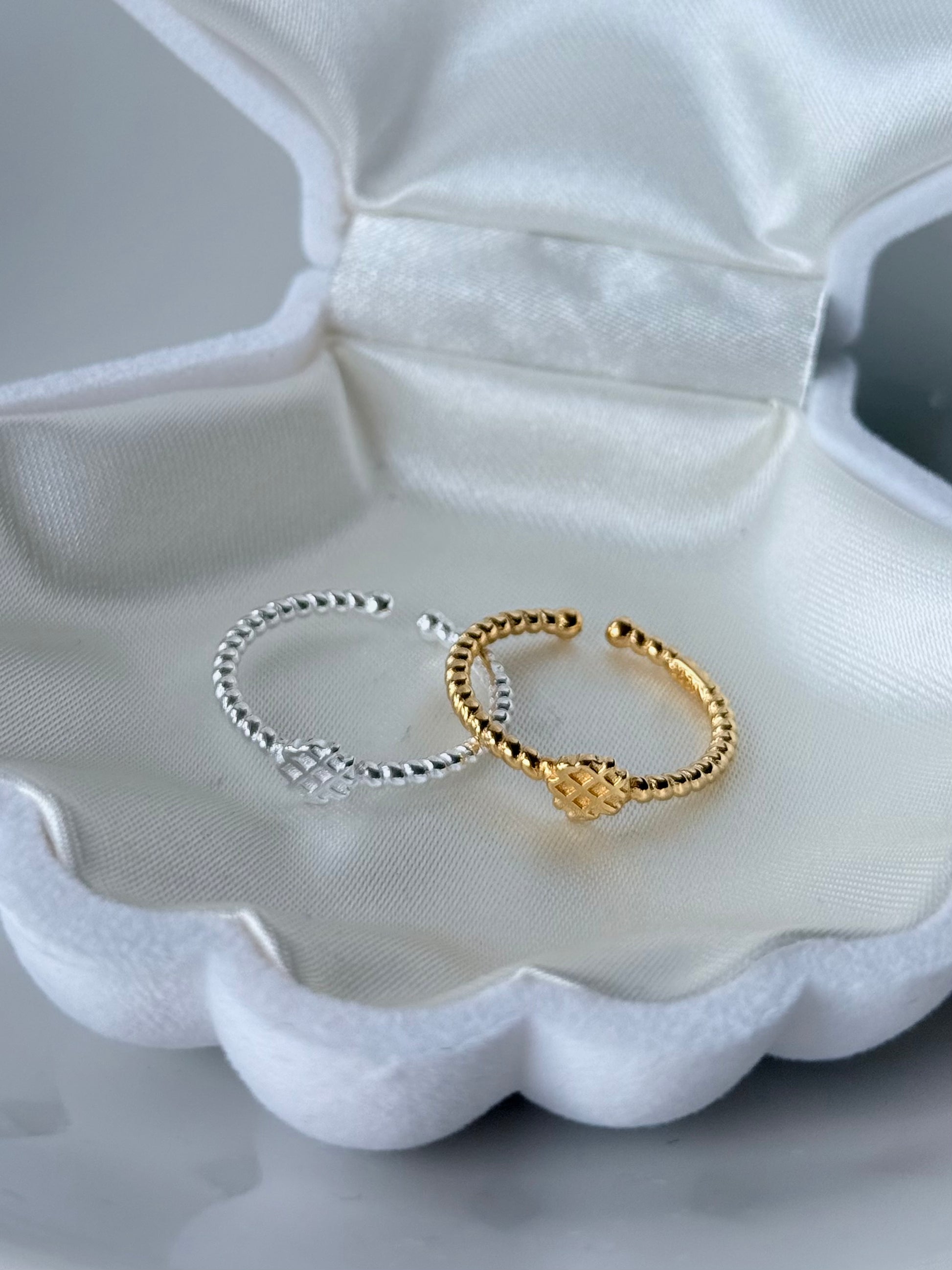 進指尖。金色焦糖、銀色奶油,怎麼搭都剛剛好——單戴清新、疊戴更上癮。手指上的小點心:編織感戒圈像奶油